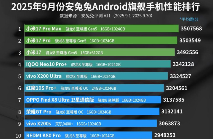 近期安兔兔公布了最新一期性能排行榜,小米17系列正好赶在10月之前上市,也进入了排行榜单,而且三款新机独占前三,小米17 pro max则以3507568的高分排在第一名。